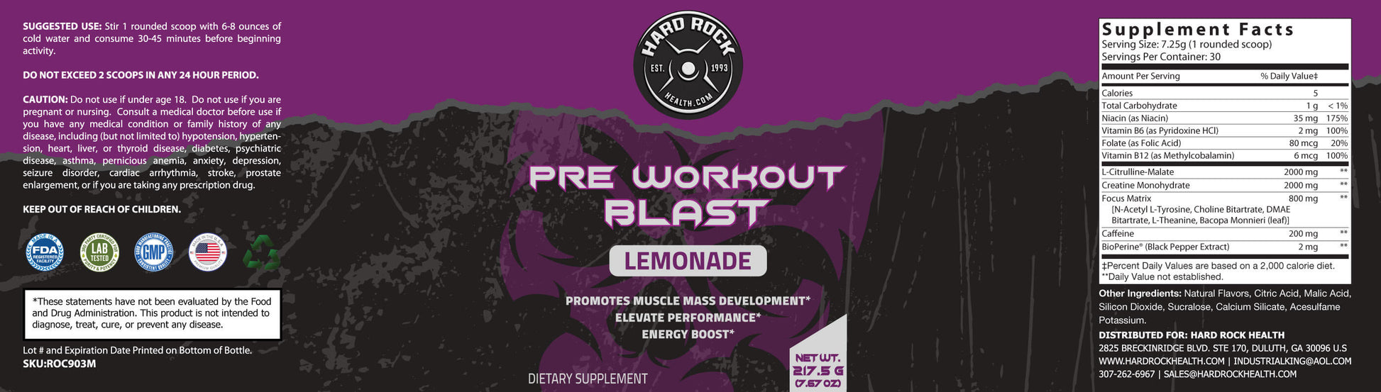 Try our Pre-Workout Blast Grape Lemonade Flavor by Hard Rock Health which contains most effective and tested ingredients, with no unnecessary or expensive additions. Hard Rock Health® Pre-Workout Blast is a simple pre-workout supplement that has everything you'll need to stay in shape.